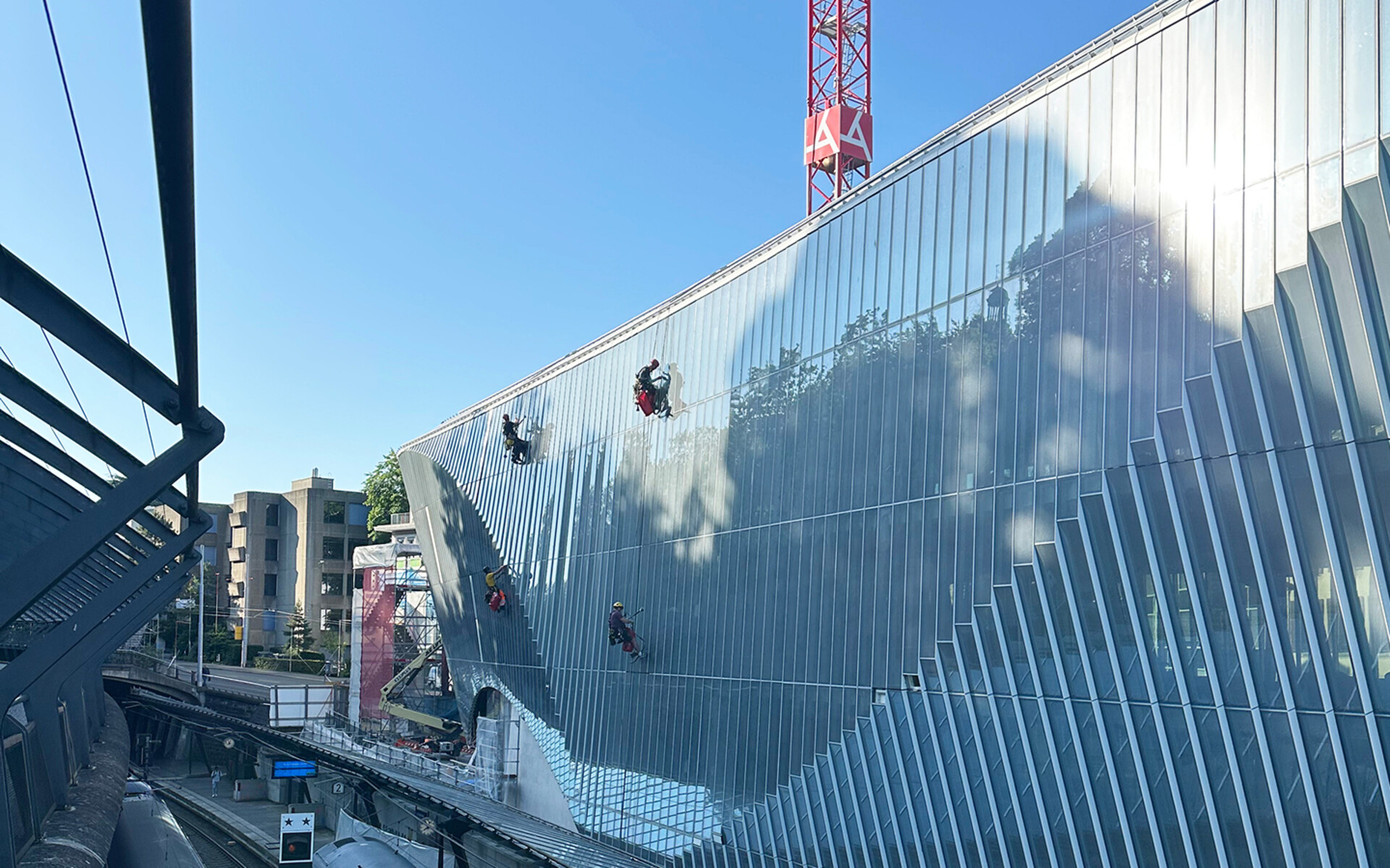 Das Haus zum Falken ist architektonisch durchaus gewagt. Im Zürcher Gemeinderat reichte die Palette der Bezeichnungen von «Hochseejacht» bis zu «gestrandeter Wal» – je nach persönlicher Haltung zu der spektakulären Architektur. Die Baubewilligung beschreibt das Gebäude überraschend poetisch als Bau mit «einem gerippten, ziehharmonikaartigen Glas-Aluminium-Kleid». Wir konnten bei GRIP den Baufortschritt von 2022 bis 2025 stetig mitverfolgen. Was schon auf den Visualisierungen beeindruckend aussah, präsentiert sich nach der Fertigstellung fast noch eindrücklicher. Von aussen erscheint der Bau filigran und gleichzeitig wuchtig, innen wirken die im Rohbau noch offenen, weitläufigen Raumlayouts mit ihren Streben durchsetzten Glasfronten transparent und futuristisch, wie uns ein Rundgang für Anwohnende und Interessierte vor dem Endausbau vor Augen führte.